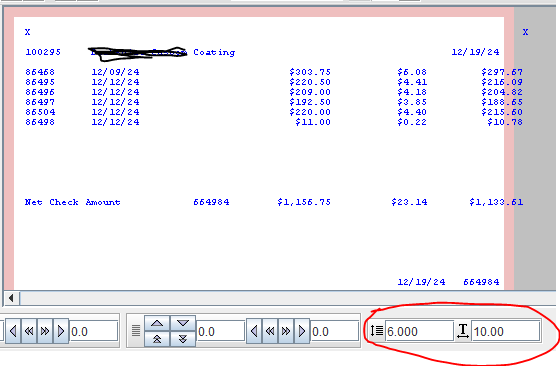 - Determine if changes are needed. The following document displays too wide. Usually, you can change the lines per inch and characters per inch values, circled below in red. However, if the data file has set the font values, changes cannot be made.