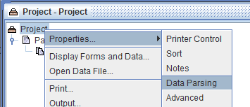 - To override the font settings in the document, right click the project name (Project in this example) > Properties > Data Parsing.