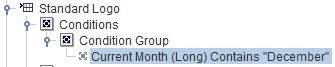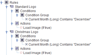 Be sure you understand the logic of your requirement. You can have groups and nested Boolean AND and OR conditions. The following example sets conditions on two rules, one to place the Christmas logo every day in December, and the other to use the standard logo the rest of the year.