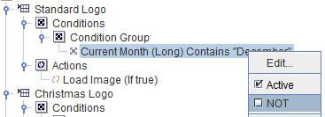 - To change the condition for Standard Logo to the negative, right click the condition > NOT. The Standard Logo is used when the value does not contain December. The Christmas logo is used during December.
