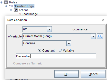 - In the variable field, select Current Month (Long), and in the value field, type December. Click OK.