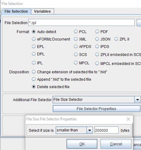 - The program writing files for eFORMz to pick up has had unusually large files that create performance issues. For example, a ZPL file that contains a single shipping label might be 3 KB. An order with three boxes requires three shipping labels, and the ZPL file with those three labels might be 9 KB. However, if eFORMz picks up a ZPL file that is 40 MB, it can result in unanticipated results and potentially cause production to stop. An anomaly such as this must be dealt with separately, perhaps route the very large ZPL file to a breaker project to create many smaller ZPL files. You can instruct eFORMz to only pick up ZPL files that are under 200 KB, as shown below. Depending on your system configuration and your shipping practices, this number might require evaluation to determine whether is it appropriate for your solution.